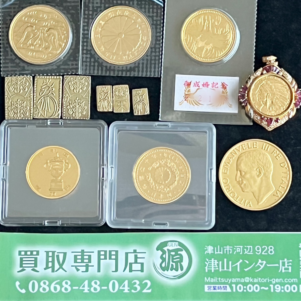 天皇10万円金貨、御成婚5万金貨、ラクビーワールドカップ1万金貨、二分判金、一分金、外国金貨を買取りました。買取専門店 源 津山インター店