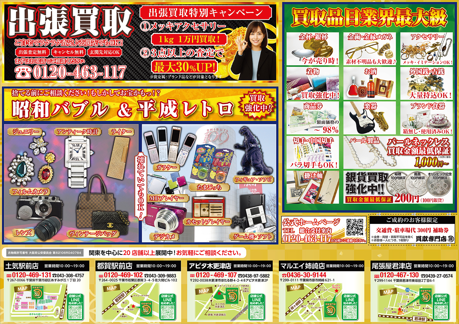 LINE査定、ご自宅にお伺いする出張買取などもございますのでお気軽にご連絡ください。