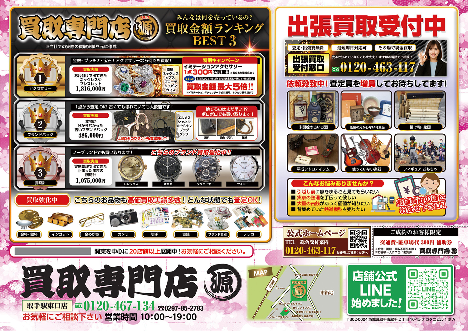 LINE査定、ご自宅にお伺いする出張買取などもございますのでお気軽にご連絡ください。
